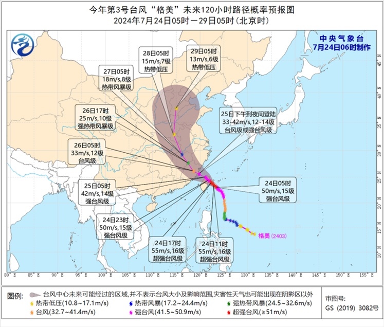 預(yù)計(jì),“格美”將以每小時(shí)10-15公里的速度向西北方向移動(dòng),強(qiáng)度逐漸增強(qiáng),最強(qiáng)可達(dá)超強(qiáng)臺(tái)風(fēng)級(jí)(52-58米/秒,16-17級(jí)),并將于24日晚上在臺(tái)灣島中北部沿海登陸(強(qiáng)臺(tái)風(fēng)級(jí),14-15級(jí),45-50米/秒)。之后穿過(guò)臺(tái)灣島,將于25日下午到夜間在福建福鼎到晉江一帶沿海登陸(臺(tái)風(fēng)級(jí)或強(qiáng)臺(tái)風(fēng)級(jí),12-14級(jí),33-42米/秒)。然后深入內(nèi)陸北上,強(qiáng)度逐漸減弱。