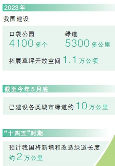 我國(guó)將綠色發(fā)展理念融入城鄉(xiāng)規(guī)劃建設(shè)管理中,穩(wěn)步推進(jìn)建設(shè)連通區(qū)域、城市、社區(qū)的城鄉(xiāng)綠道體系。2023年,我國(guó)建設(shè)口袋公園4100多個(gè)、綠道5300多公里,拓展草坪開放空間1.1萬公頃,截至今年5月底,已建設(shè)各類城市綠道約10萬公里。