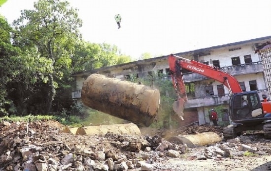 圖③:工作人員用挖掘機(jī)挖出油罐體。