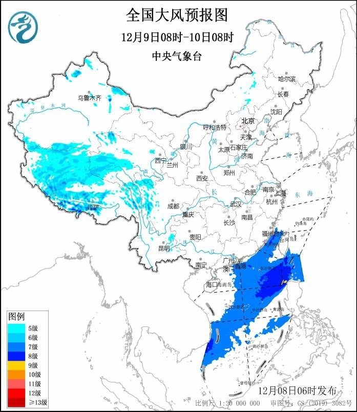 預(yù)計(jì),12月8日08時至9日08時,西藏中西部、青海西南部、川西高原、新疆北部等地部分地區(qū)將有5~6級風(fēng),西藏中西部和青海西南部局地風(fēng)力可達(dá)7~8級;東海大部、臺灣海峽、臺灣以東洋面、巴士海峽、南海北部、中部和西南部海域、北部灣將有7~8級、陣風(fēng)9級的大風(fēng),其中臺灣海峽部分海域的風(fēng)力可達(dá)9級、陣風(fēng)10級。