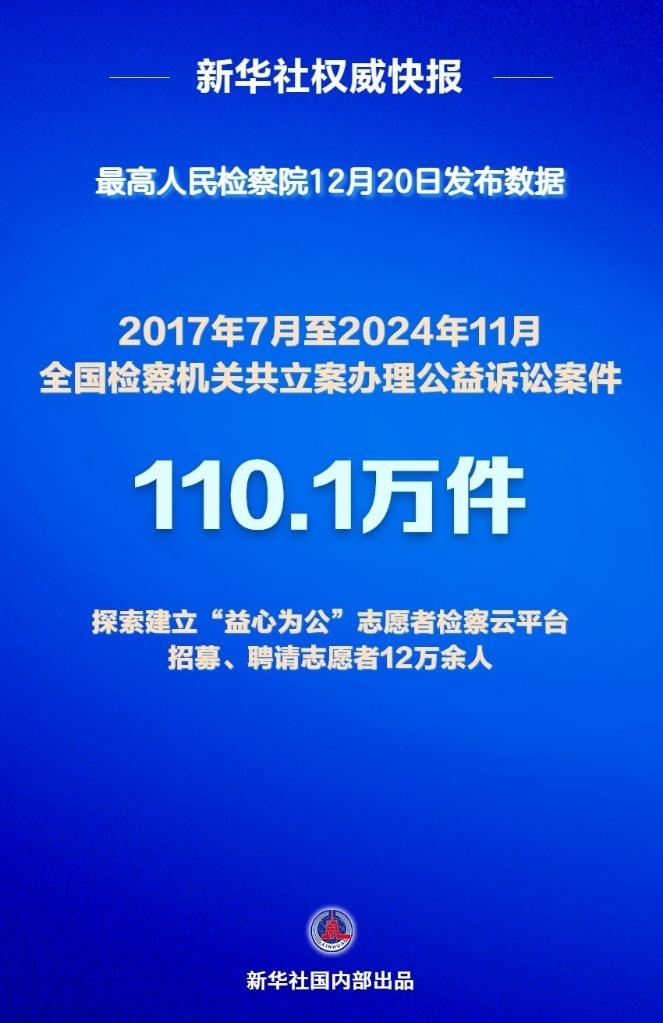 最高人民檢察院12月20日發(fā)布檢察公益訴訟有關(guān)情況顯示,2017年7月至2024年11月,全國檢察機(jī)關(guān)共立案辦理公益訴訟案件110.1萬件,其中行政公益訴訟案件98.9萬件,民事公益訴訟案件11.2萬件。