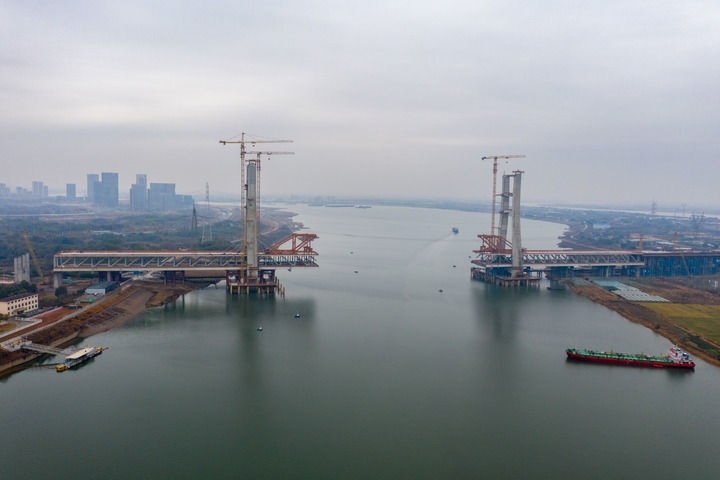 這是1月31日拍攝的昌九高鐵南昌揚(yáng)子洲贛江公鐵大橋(西支)施工現(xiàn)場(chǎng)(無(wú)人機(jī)照片)。新華社記者 郭杰文 攝