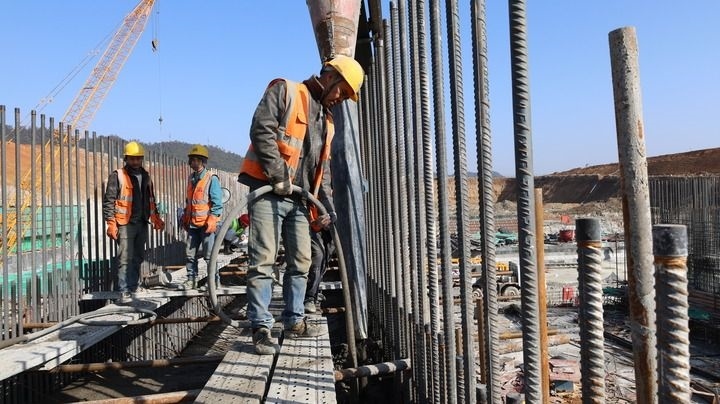 1月28日,工人在江西省景德鎮(zhèn)市樂(lè)平水利樞紐工程建設(shè)現(xiàn)場(chǎng)施工。新華社發(fā)(賀蔚安 攝)
