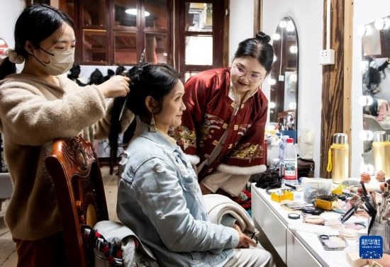 2月3日,在福州三坊七巷一處“三條簪”化妝跟拍點,化妝師在為來自上海的母女進(jìn)行“三條簪”妝造。