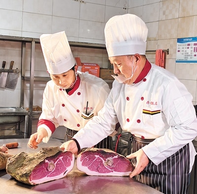 宣威市存香飯店,大廚徐天勇正忙著挑選食材,而烏金豬是制作宣威火腿的最佳原料。“腌制過程也很重要,鹽的比例要恰到好處,多一分則咸,少一分則不夠味,經(jīng)過兩三年發(fā)酵,火腿就可以達到生吃的標準了?!毙焯煊掠霉轻樰p輕插入火腿的上、中、下部,火腿肉質(zhì)清香撲鼻,“就是它了?!?/p>