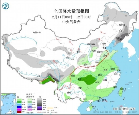 全國(guó)降水量預(yù)報(bào)圖(2月10日08時(shí)-11日08時(shí)) 圖片來(lái)源:中央氣象臺(tái)網(wǎng)站