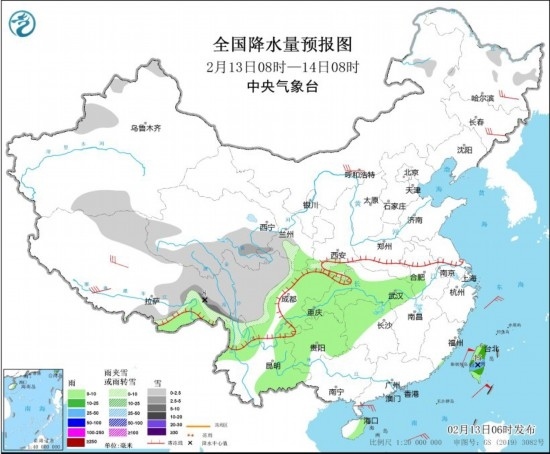 全國降水量預(yù)報(bào)圖(2月13日08時(shí)-14日08時(shí)) 圖片來源:中央氣象臺(tái)網(wǎng)站