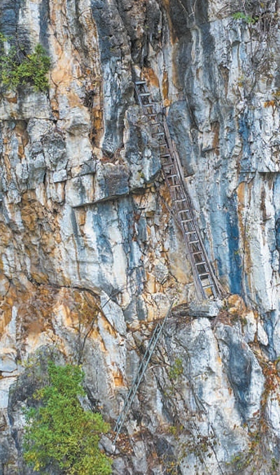 第三條路被村民們稱作“天路”。這是一段垂直高度200米的懸崖峭壁,大約1小時就能抵達山頂,但全程需要沿峭壁攀爬。“爬的時候根本不敢往下看,只有初中的大孩子偶爾會在家長帶領下走這條路。”錢慶輝說。