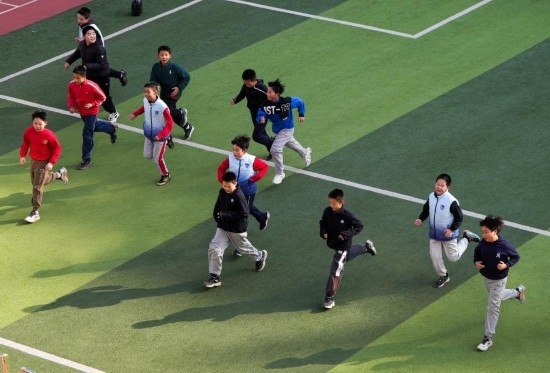 2月21日,在北京市宣武師范學(xué)校附屬第一小學(xué),學(xué)生在體育課上跑步熱身。新華社記者 鞠煥宗 攝