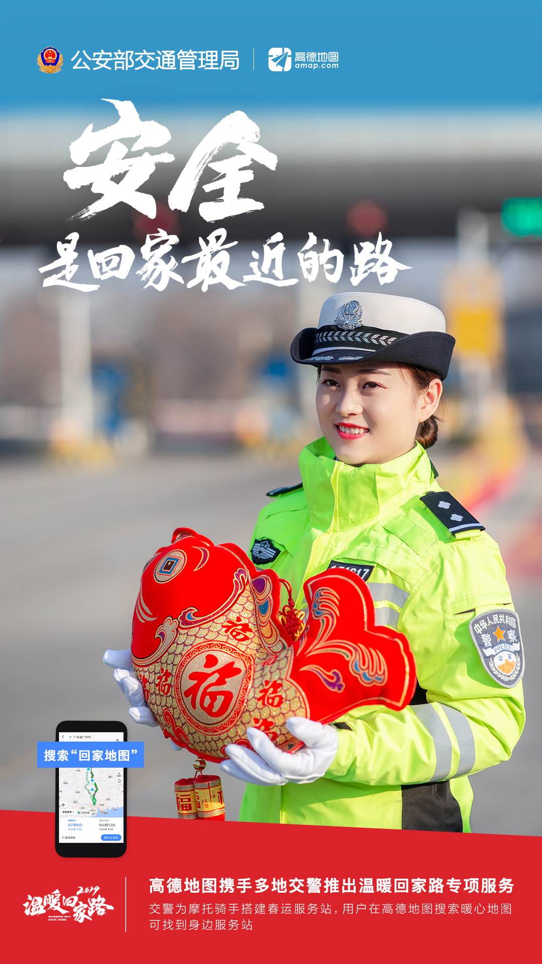 為做好2019年春運(yùn)保障工作,特別是發(fā)動社會力量做好交通安全社會協(xié)同治理,廣東、廣西、福建、江西、湖北、云南、安徽、四川、湖南等春運(yùn)重點(diǎn)省、自治區(qū)交警總隊聯(lián)合高德地圖啟動2019年春運(yùn)“溫暖回家路”專項,推出“回家地圖”系列在線服務(wù),通過“交警+科技”結(jié)合,助力人民群眾安全返鄉(xiāng)。同時,與人民日報社、新華社、中央廣播電視總臺等媒體,以及中廣聯(lián)合會、中國交通頻道等機(jī)構(gòu)和微博、秒拍、一直播等新媒體平臺聯(lián)動,共同開展2019年春運(yùn)交通安全宣傳工作。