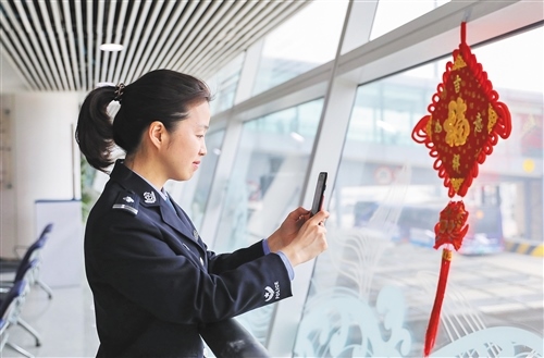 2月6日,青島機(jī)場(chǎng)出入境邊防檢查站女子旅檢科民警馮哲利用工作間隙與遠(yuǎn)在老家的兒子視頻通話(huà)。解豪攝(新華社發(fā))