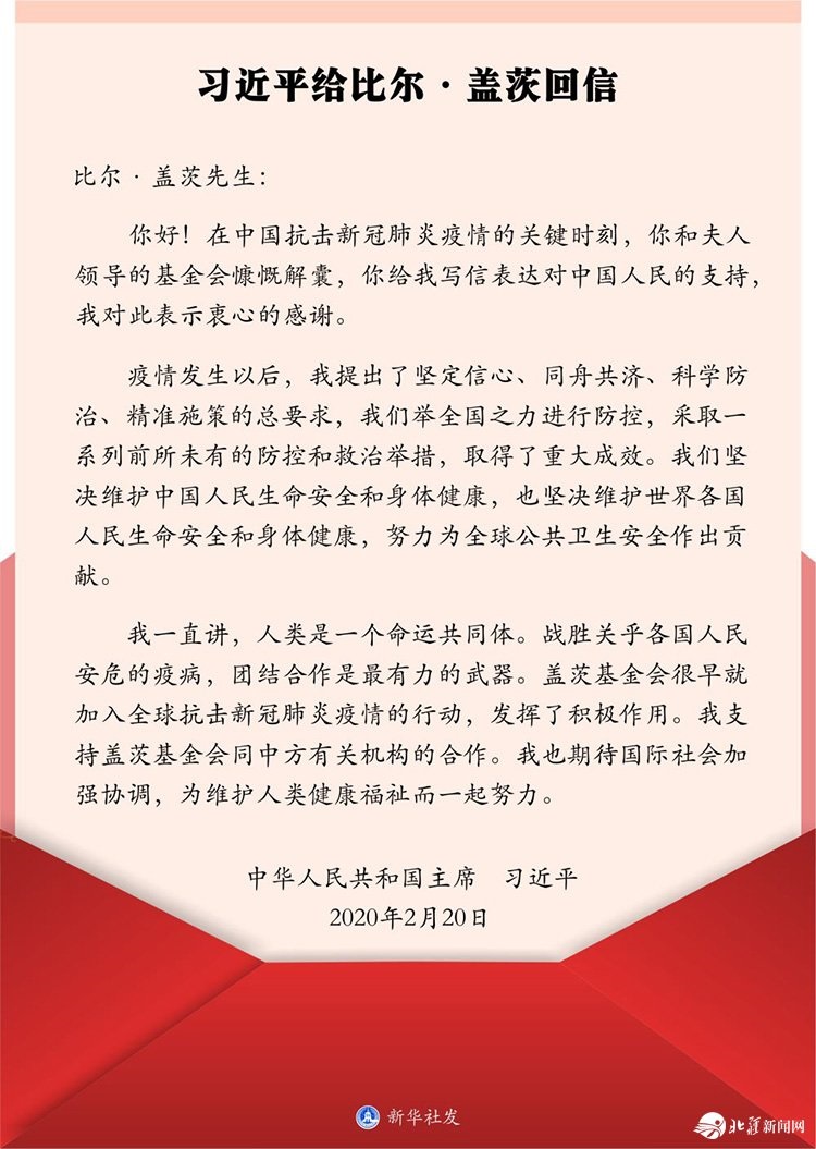 比爾·蓋茨專門致信習(xí)近平主席,贊賞中國政府和中國人民在抗擊疫情中的表現(xiàn),表示將堅定支持中國打贏這場關(guān)鍵戰(zhàn)役。