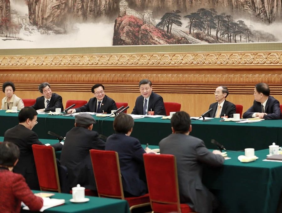 △2019年3月8日,習(xí)近平參加十三屆全國人大二次會議河南代表團(tuán)的審議。
