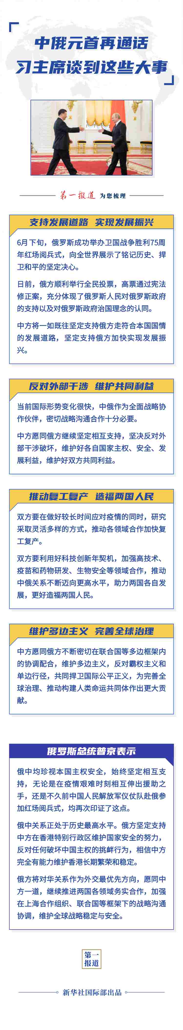普京表示,近日俄羅斯全民投票高票通過憲法修正案,有助于維護(hù)俄長期政治穩(wěn)定,更好捍衛(wèi)國家主權(quán),反對(duì)外部干涉。俄中均珍視本國主權(quán)安全,始終堅(jiān)定相互支持,無論是在疫情艱難時(shí)刻相互伸出援助之手,還是不久前中國人民解放軍儀仗隊(duì)赴俄參加紅場(chǎng)閱兵式,均再次印證了這點(diǎn)。俄中關(guān)系正處于歷史最高水平。俄方堅(jiān)定支持中方在香港特別行政區(qū)維護(hù)國家安全的努力,反對(duì)任何破壞中國主權(quán)的挑釁行為,相信中方完全有能力維護(hù)香港長期繁榮和穩(wěn)定。俄方將對(duì)華關(guān)系作為外交最優(yōu)先方向,愿同中方一道,繼續(xù)推進(jìn)兩國各領(lǐng)域務(wù)實(shí)合作,加強(qiáng)在上海合作組織、聯(lián)合國等框架下的戰(zhàn)略溝通協(xié)調(diào),維護(hù)全球戰(zhàn)略穩(wěn)定與安全。