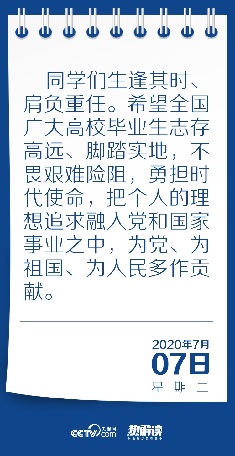 習(xí)近平總書記在回信中高度肯定了同學(xué)們到邊疆基層工作的選擇,并對廣大高校畢業(yè)生提出殷切期望:“希望全國廣大高校畢業(yè)生志存高遠、腳踏實地,不畏艱難險阻,勇?lián)鷷r代使命,把個人的理想追求融入黨和國家事業(yè)之中,為黨、為祖國、為人民多作貢獻?!?/p>