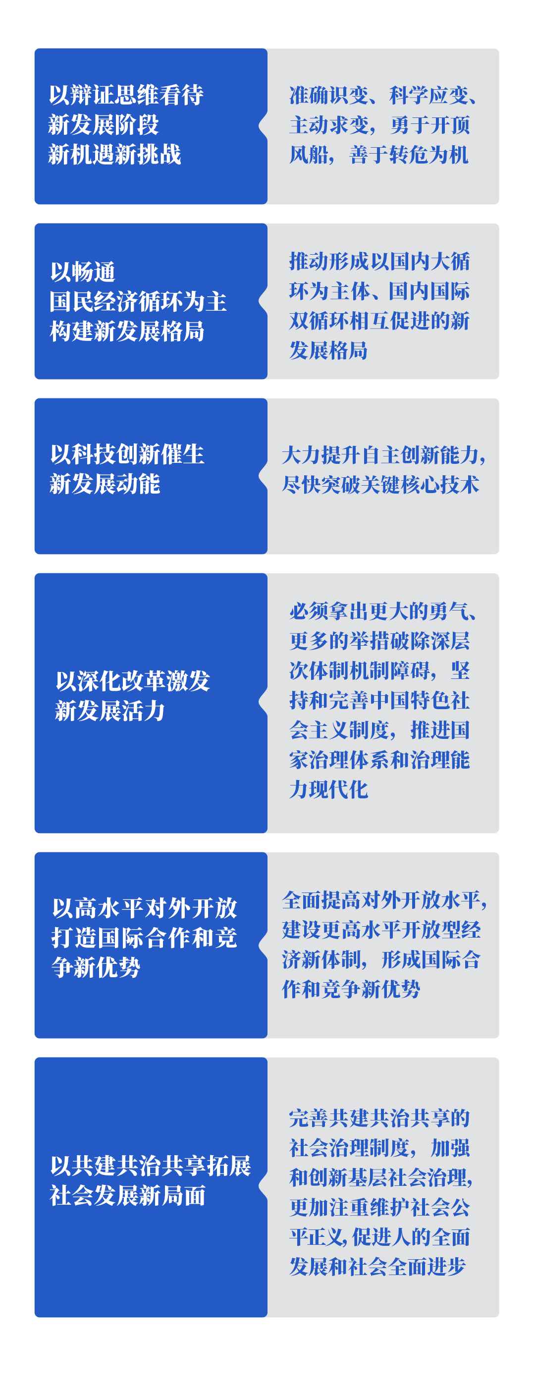 在經(jīng)濟社會領域?qū)<易剷?,習近平從黨和國家事業(yè)發(fā)展的戰(zhàn)略全局出發(fā),從新發(fā)展階段、新發(fā)展格局、新發(fā)展動能、新發(fā)展活力、國際合作和競爭新優(yōu)勢、社會發(fā)展新局面等方面提出要求。這六點要求為正確認識和把握中長期經(jīng)濟社會發(fā)展重大問題指明了方向,是“十四五”規(guī)劃編制和未來經(jīng)濟社會發(fā)展的重要遵循。