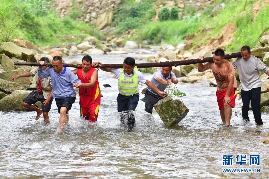 在位于黔桂交界大苗山深處的烏英苗寨,駐村第一書(shū)記韋桂華(右四)、黨員梁成兵(右三)、梁志新(左二)帶領(lǐng)村民維修河堤(2019年6月30日攝)。新華社記者黃孝邦攝