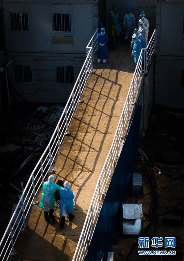 醫(yī)護(hù)人員將患者送入武漢火神山醫(yī)院病房(2020年2月4日攝,無(wú)人機(jī)照片)。新華社記者肖藝九攝