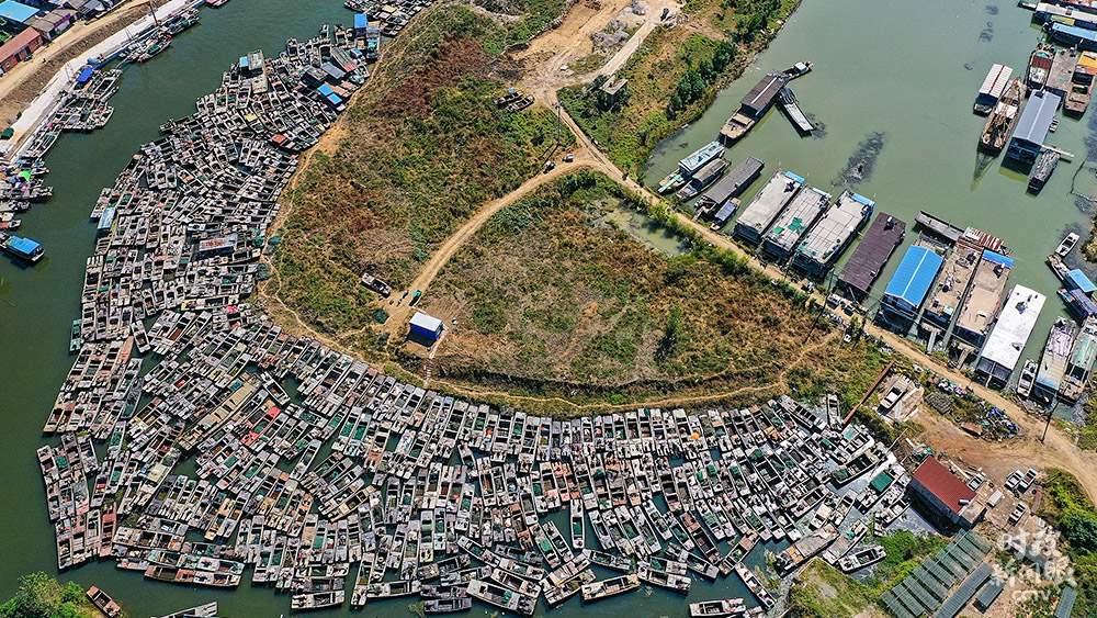 △國家實(shí)施長江流域禁捕退捕政策后,江蘇宿遷泗洪縣啟動洪澤湖水域禁捕退捕和住家船整治工作。這是聚集在漁港等待拆解的漁船。