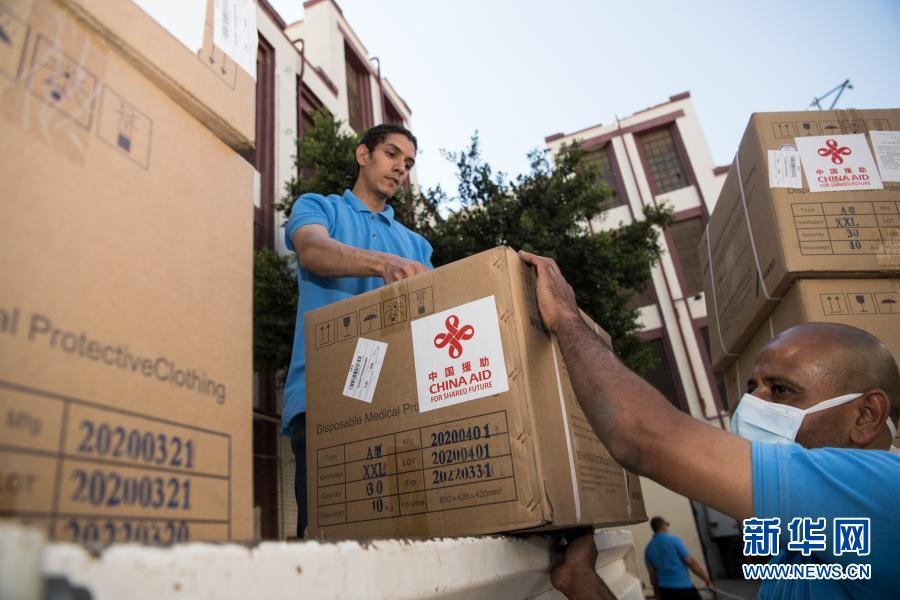 2020年5月10日,在埃及首都開羅,工作人員搬運(yùn)中國政府援助的抗疫物資。新華社記者 鄔惠我 攝