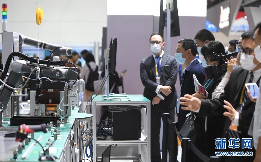2020年11月6日,在進(jìn)博會(huì)技術(shù)裝備展區(qū),人們?cè)谖鏖T子展臺(tái)觀看人機(jī)協(xié)作的智能化單元生產(chǎn)線。新華社記者 李任滋 攝