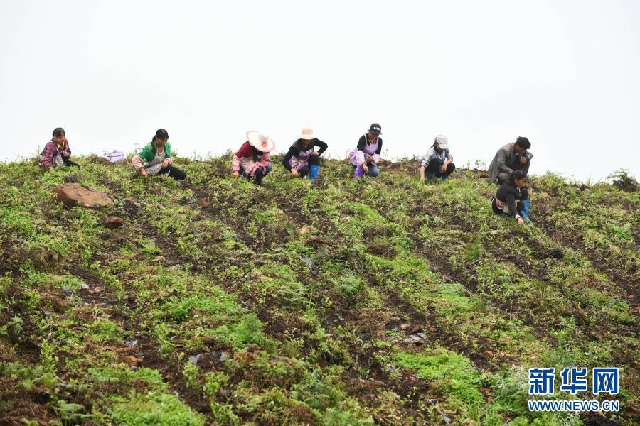 農(nóng)民在貴州省普安縣地瓜鎮(zhèn)屯上村的“扶貧茶園”里給茶苗除草(2019年7月7日攝)。當(dāng)?shù)氐牟鑸@栽種有浙江安吉黃杜村捐贈(zèng)的白茶苗。新華社記者 楊文斌 攝