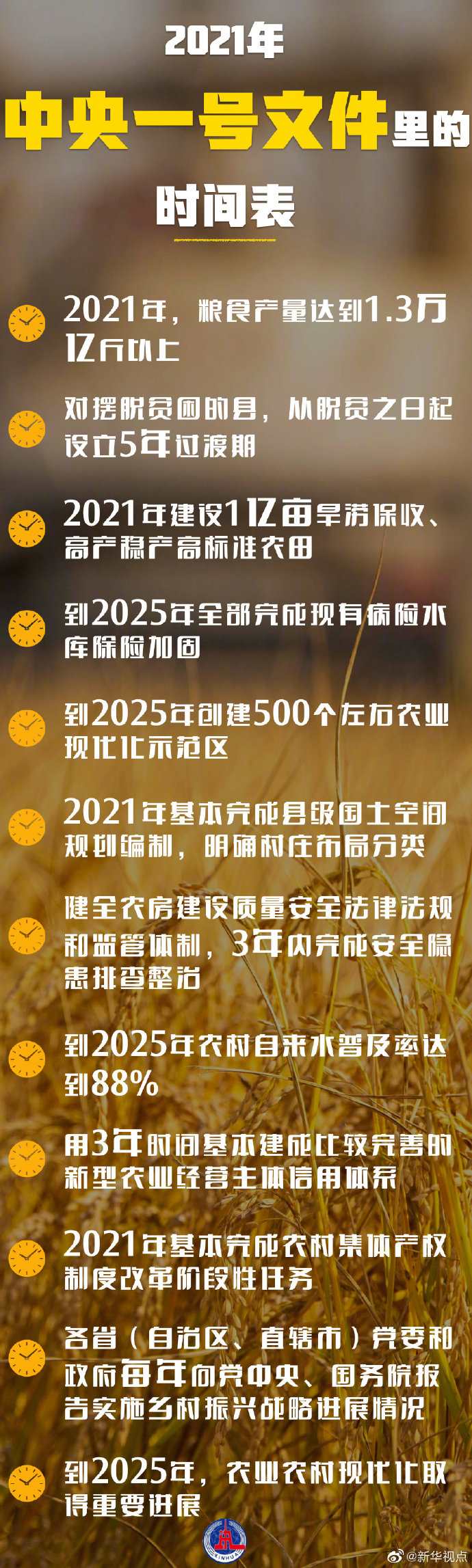 2021年糧食產(chǎn)量達(dá)到1.3萬億斤以上、2021年建設(shè)1億畝高標(biāo)準(zhǔn)農(nóng)田、到2025年農(nóng)村自來水普及率達(dá)到88%……今年中央一號文件仍聚焦“三農(nóng)”,對多方面工作作出詳細(xì)部署,明確了時間表。一起了解下↓
