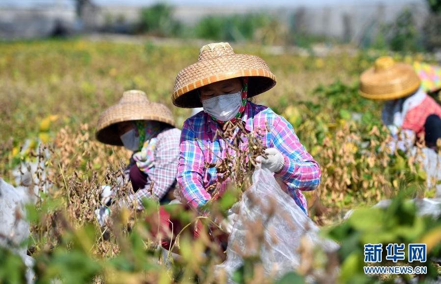 工人在采收中國農(nóng)業(yè)科學(xué)院油料作物研究所在三亞繁育的大豆(2020年2月27日)。新華社記者 郭程 攝