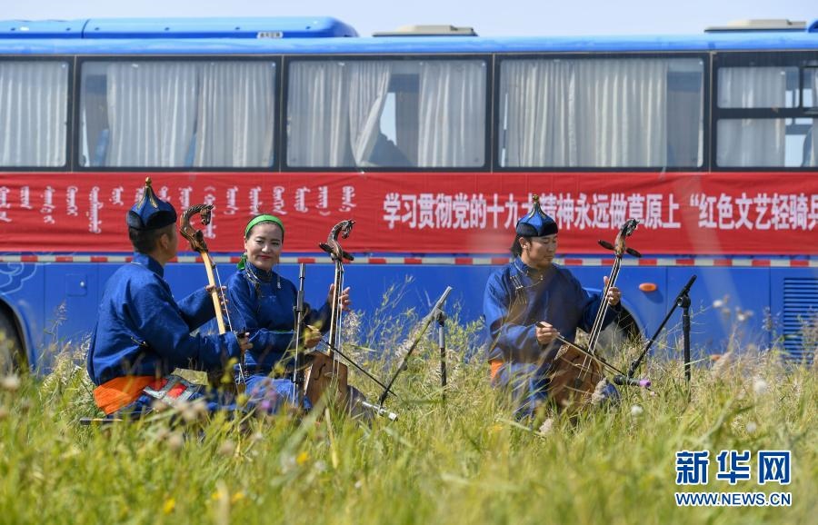 2018年9月13日,在內(nèi)蒙古自治區(qū)錫林郭勒盟鑲黃旗寶格達音高勒蘇木浩尼欽哈夏圖嘎查的一處草場,鑲黃旗烏蘭牧騎的隊員在為牧民表演文藝節(jié)目。新華社記者