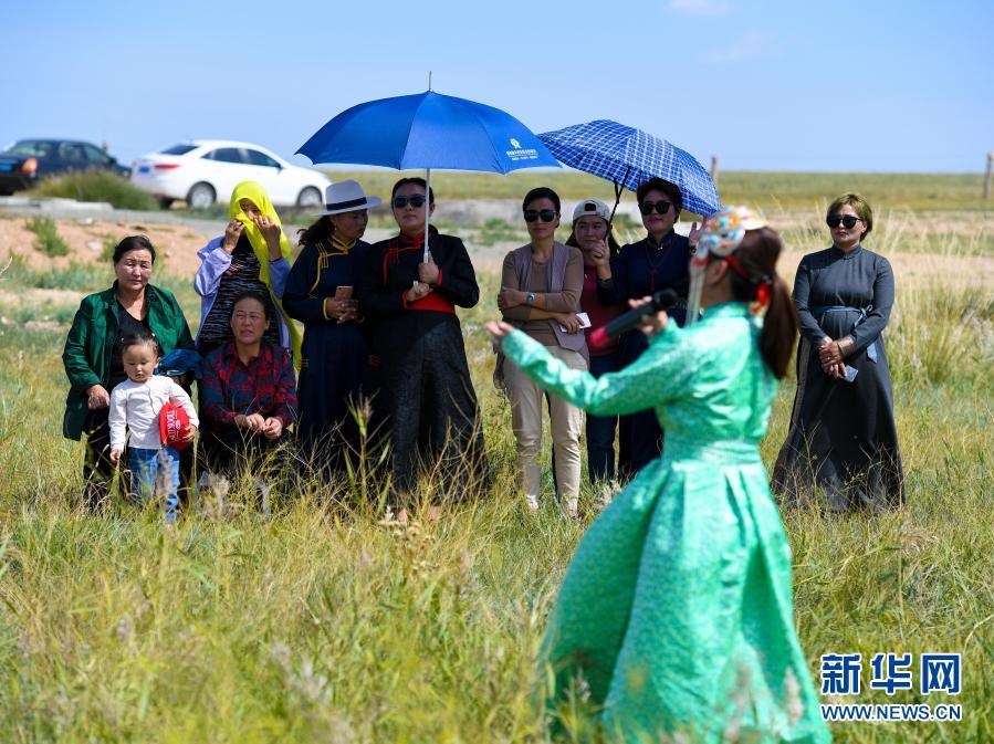 2018年9月13日,在內(nèi)蒙古自治區(qū)錫林郭勒盟鑲黃旗寶格達音高勒蘇木浩尼欽哈夏圖嘎查的一處草場,鑲黃旗烏蘭牧騎的隊員在為牧民表演文藝節(jié)目。新華社記者 彭源 攝
