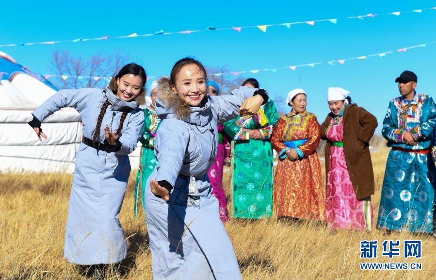 2018年11月9日,內(nèi)蒙古自治區(qū)錫林郭勒盟烏蘭牧騎隊員來到西烏珠穆沁旗烏蘭哈拉嘎蘇木新高勒嘎查的黨員中心戶恩克巴雅爾家,為周邊牧民表演舞蹈。新華社記者 彭源 攝