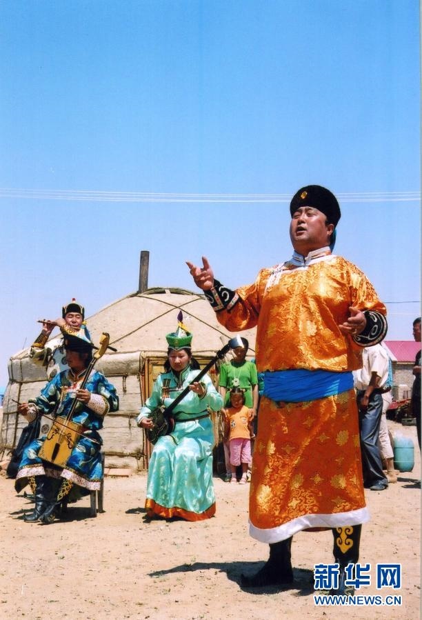 錫林郭勒盟烏蘭牧騎隊員在草原上表演節(jié)目(資料照片)。新華社發(fā)