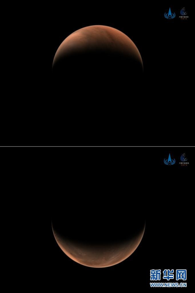2021年3月26日,國家航天局發(fā)布2幅由我國首次火星探測(cè)任務(wù)天問一號(hào)探測(cè)器拍攝的南、北半球火星側(cè)身影像。這是一張拼版照片,上圖為:北半球上方火星影像;下圖為:南半球上方火星影像。