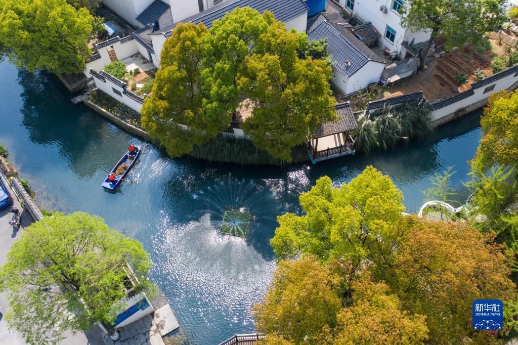 在浙江省長興縣龍山街道渚山村,保潔人員進(jìn)行日常河道護(hù)理巡查(2020年4月9日攝,無人機照片)。新華社記者徐昱攝