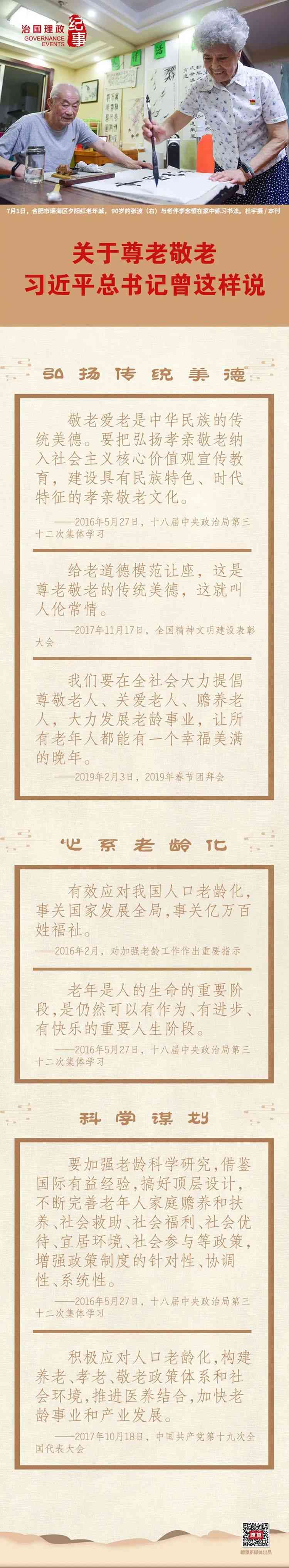 “古人講,‘夫孝,德之本也’。自古以來,中國人就提倡孝老愛親,倡導(dǎo)老吾老以及人之老、幼吾幼以及人之幼。我國已經(jīng)進(jìn)入老齡化社會。讓老年人老有所養(yǎng)、老有所依、老有所樂、老有所安,關(guān)系社會和諧穩(wěn)定?!?019年春節(jié)團(tuán)拜會上,習(xí)近平總書記這樣講述他心中的“孝”與尊老敬老傳統(tǒng)美德。