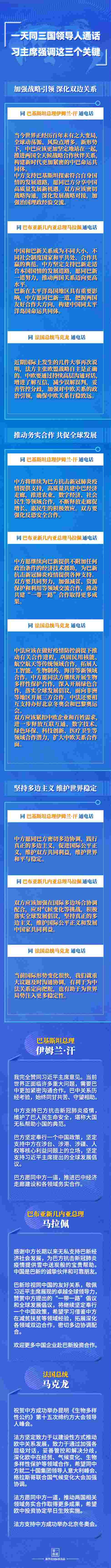 中國和巴基斯坦是“全天候戰(zhàn)略合作伙伴關系”;中國和巴新是“不同大小、不同社會制度國家和平共處、合作共贏的典范”;中國和法國同為聯(lián)合國安理會常任理事國……3次通話內容豐富,“第一報道”為您梳理——