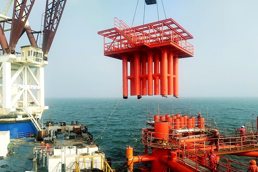 2021年8月21日,中國石化勝利油田海上新建產(chǎn)能項目埕北208井口平臺吊裝安全就位。(勝利油田供圖)