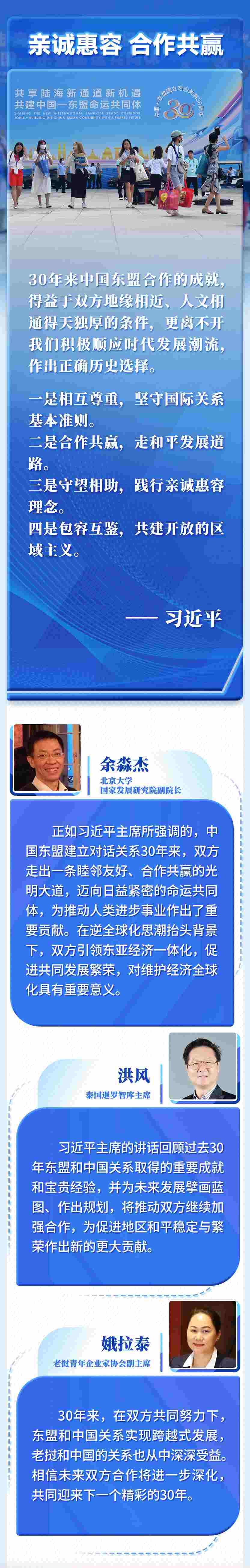 30年的寶貴經(jīng)驗(yàn)是中國(guó)和東盟的共同財(cái)富,為雙方發(fā)展全面戰(zhàn)略伙伴關(guān)系奠定了基礎(chǔ)、提供了遵循。我們要倍加珍惜、長(zhǎng)久堅(jiān)持,并在新的實(shí)踐中不斷豐富和發(fā)展。