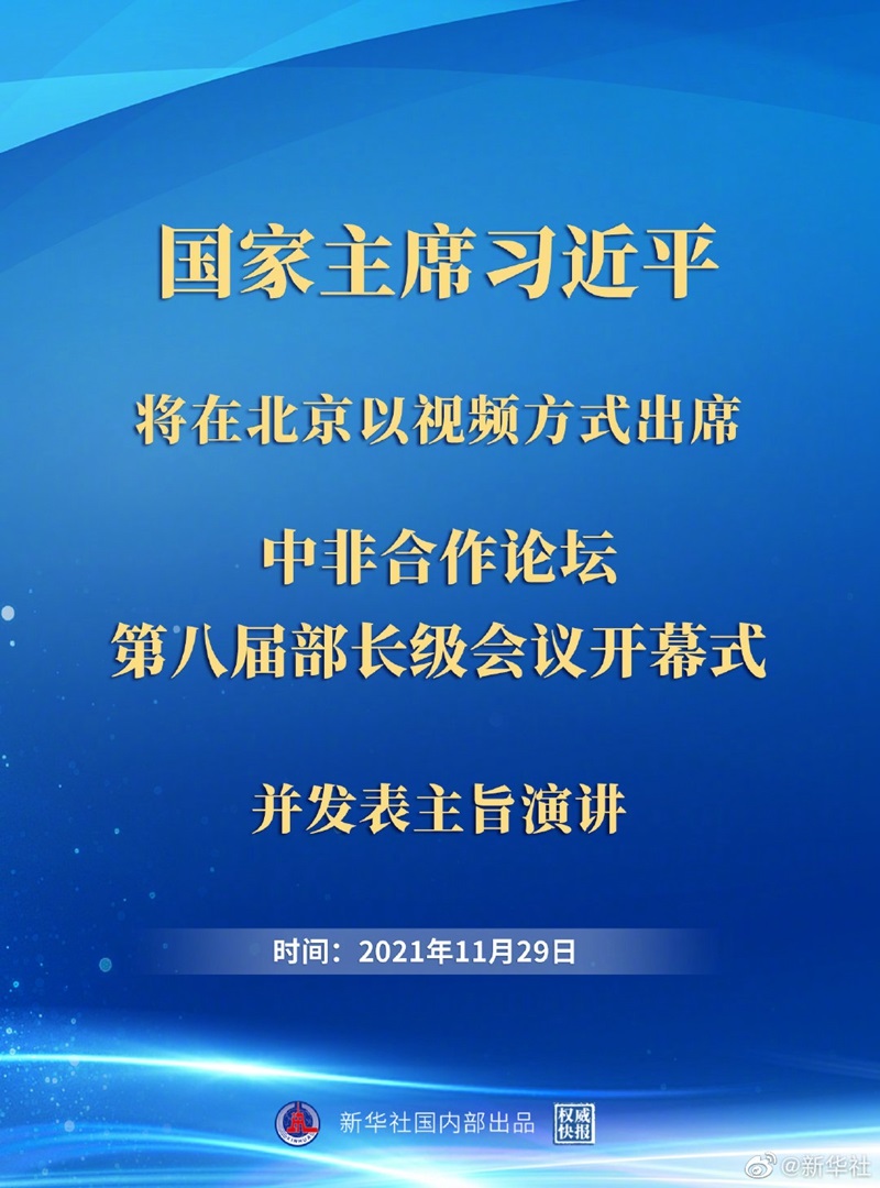 新華社北京11月26日電 外交部發(fā)言人華春瑩26日宣布:國家主席習近平將于11月29日在北京以視頻方式出席中非合作論壇第八屆部長級會議開幕式并發(fā)表主旨演講。