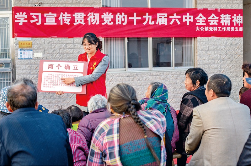 2021年11月18日,江蘇省南通市海安市大公鎮(zhèn)黨員志愿者在常河村12組向村民宣傳黨的十九屆六中全會精神,用老百姓聽得懂、能領(lǐng)會的方式將全會精神傳達(dá)到基層。人民視覺翟慧勇/攝