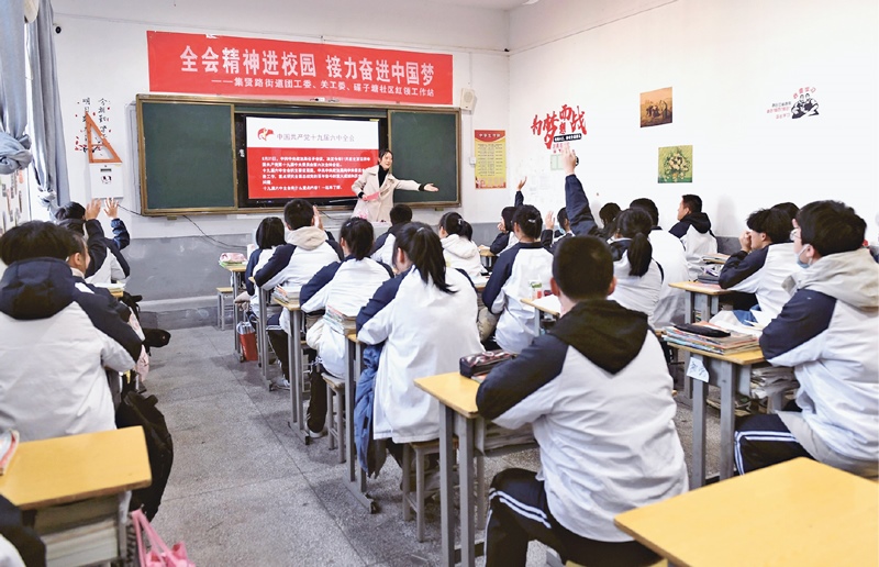 2021年11月24日,安徽省安慶市大觀區(qū)集賢路街道團(tuán)工委、碟子塘社區(qū)紅領(lǐng)工作站聯(lián)合開展黨的十九屆六中全會精神宣講進(jìn)校園活動。中新社發(fā)項順平/攝