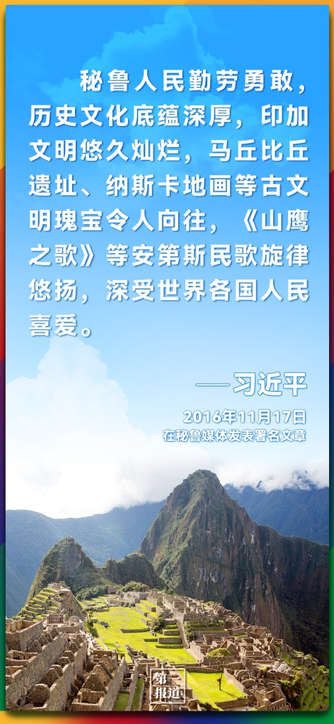 2016年對(duì)秘魯進(jìn)行國(guó)事訪問期間,習(xí)近平主席在時(shí)任秘魯總統(tǒng)庫(kù)琴斯基的陪同下,出席了中拉文化交流年閉幕式。途中參觀《文明的長(zhǎng)河——中拉文明互鑒》圖片展時(shí),共同欣賞了中秘兩國(guó)樂隊(duì)一起演奏的中國(guó)民歌《沂蒙山歌》和秘魯民歌《山鷹之歌》。