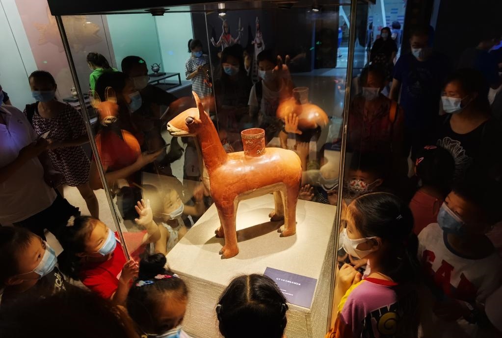 2020年7月4日,游客正在重慶中國(guó)三峽博物館觀看“失落的黃金國(guó)——安第斯文明特展”。該展以安第斯文明為主線,展出來(lái)自秘魯11家博物館的近200件套陶器、金器、紡織品等文物。