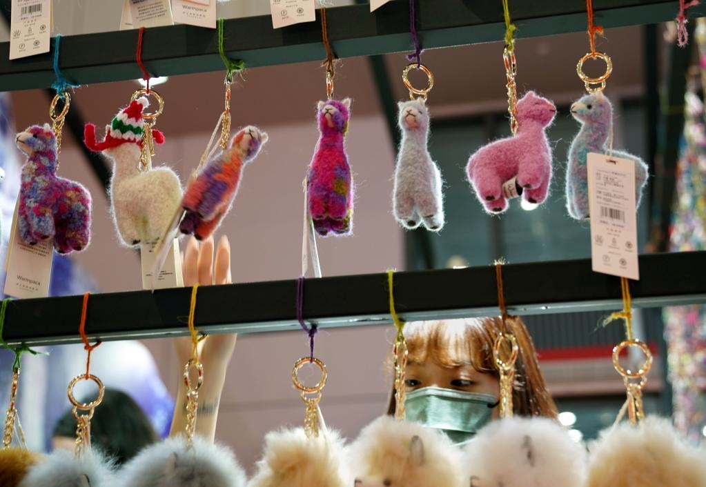 2021年11月7日,第四屆中國(guó)國(guó)際進(jìn)口博覽會(huì)上,用秘魯羊駝毛制作的掛件廣受歡迎。
