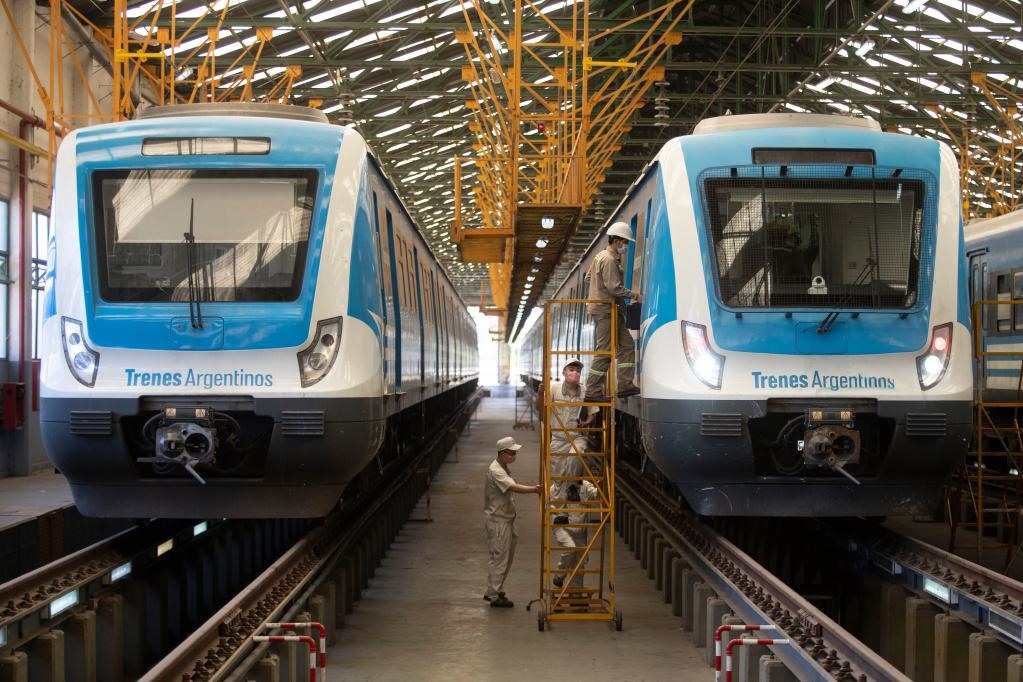 2020年11月16日,在布宜諾斯艾利斯省拉瓦約,中國(guó)和阿根廷技術(shù)人員對(duì)阿根廷城際鐵路列車進(jìn)行日常檢查。