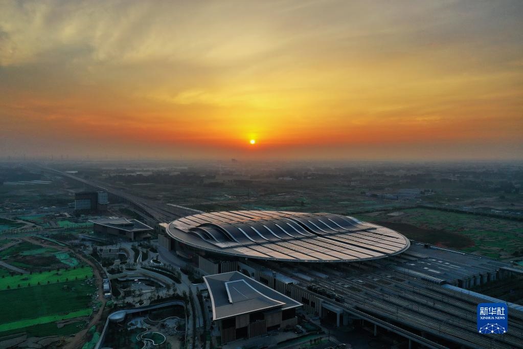 這是2021年7月1日拍攝的京雄城際鐵路雄安站(無(wú)人機(jī)照片)。新華社記者 牟宇 攝