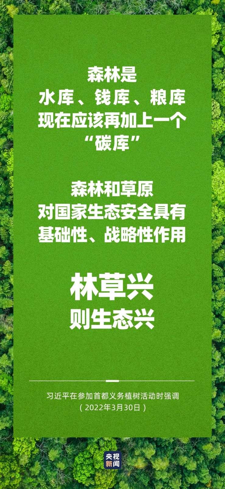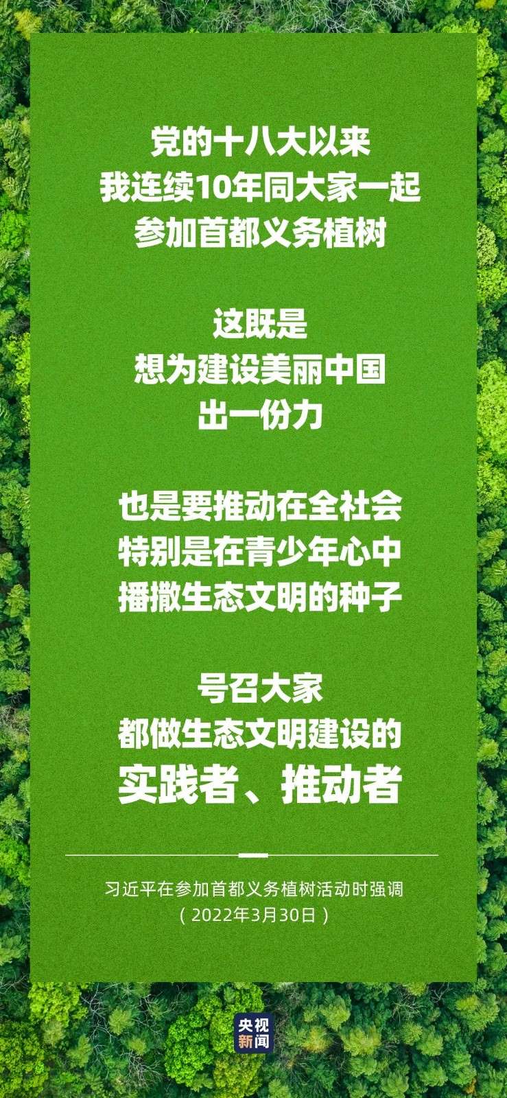中共中央總書記、國(guó)家主席、中央軍委主席習(xí)近平3月30日在參加首都義務(wù)植樹(shù)活動(dòng)時(shí)強(qiáng)調(diào),黨的十八大以來(lái),我連續(xù)10年同大家一起參加首都義務(wù)植樹(shù),這既是想為建設(shè)美麗中國(guó)出一份力,也是要推動(dòng)在全社會(huì)特別是在青少年心中播撒生態(tài)文明的種子,號(hào)召大家都做生態(tài)文明建設(shè)的實(shí)踐者、推動(dòng)者,持之以恒,久久為功,讓我們的祖國(guó)天更藍(lán)、山更綠、水更清、生態(tài)環(huán)境更美好。