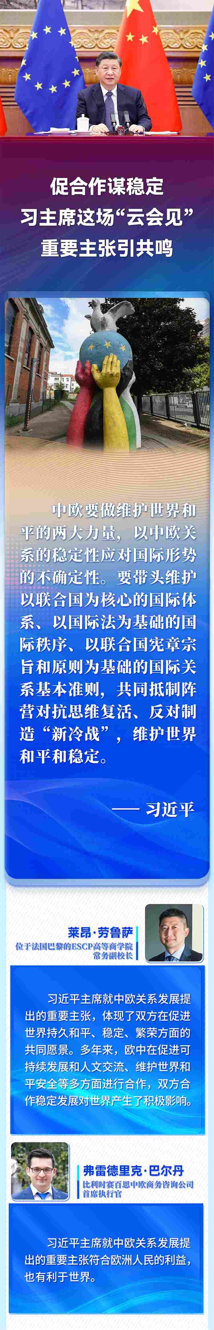 國家主席習(xí)近平4月1日晚在北京以視頻方式會見歐洲理事會主席米歇爾和歐盟委員會主席馮德萊恩。歐洲多國人士高度評價習(xí)近平主席就中歐關(guān)系、烏克蘭危機等問題提出的重要主張,認為會晤為雙方關(guān)系持續(xù)健康發(fā)展作出戰(zhàn)略引領(lǐng),為復(fù)雜動蕩的國際局勢注入穩(wěn)定性。