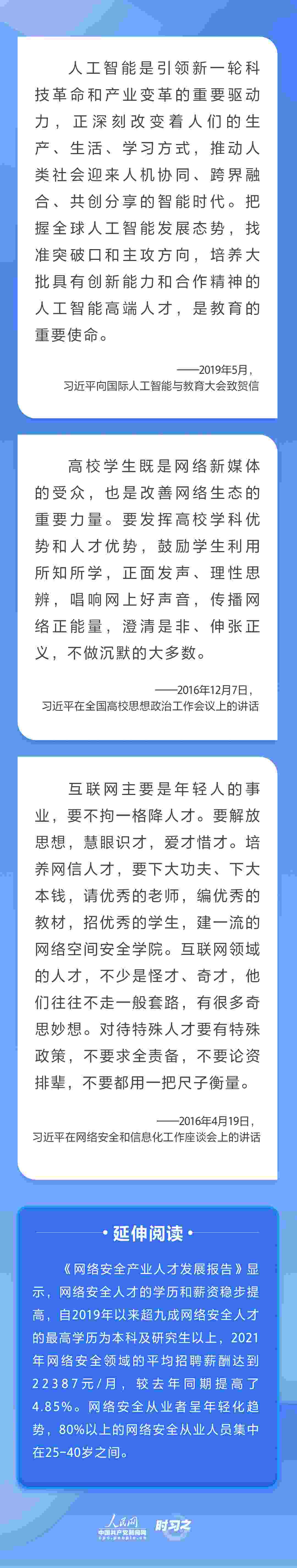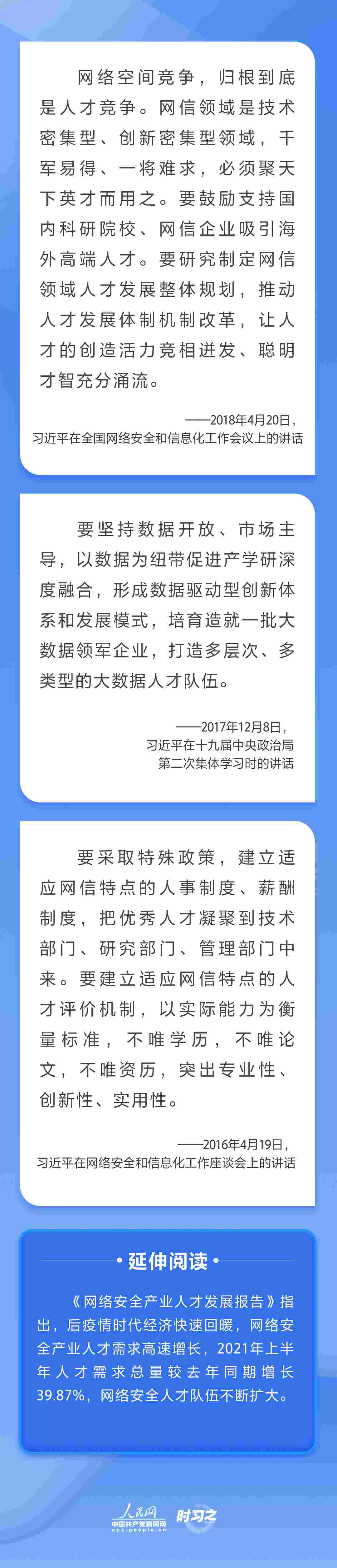“網(wǎng)信領(lǐng)域是技術(shù)密集型、創(chuàng)新密集型領(lǐng)域,千軍易得、一將難求,必須聚天下英才而用之?!秉h的十八大以來,習(xí)近平總書記多次就網(wǎng)信事業(yè)發(fā)展作出重要論述,并將抓好人才工作擺在治國理政的重要位置,為新時(shí)代網(wǎng)信人才工作和網(wǎng)信人才事業(yè)發(fā)展指明了前進(jìn)方向。