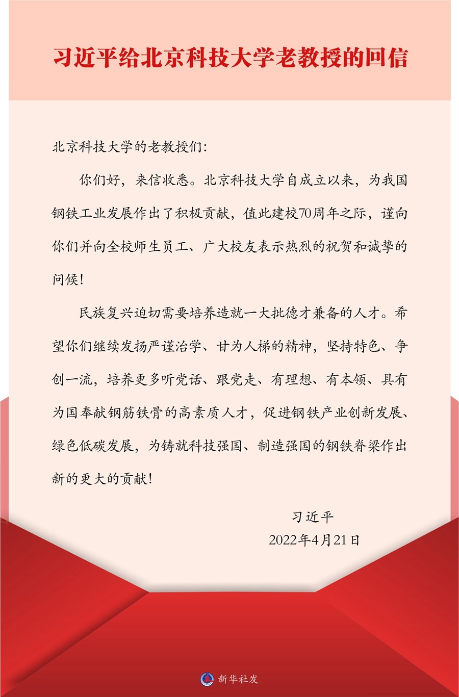 中共中央總書記、國家主席、中央軍委主席習(xí)近平4月21日給北京科技大學(xué)的老教授回信,對培養(yǎng)更多高素質(zhì)人才,促進(jìn)鋼鐵產(chǎn)業(yè)創(chuàng)新發(fā)展、綠色低碳發(fā)展提出殷切期望。